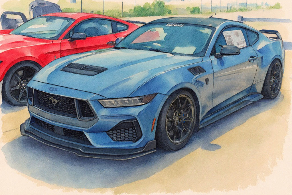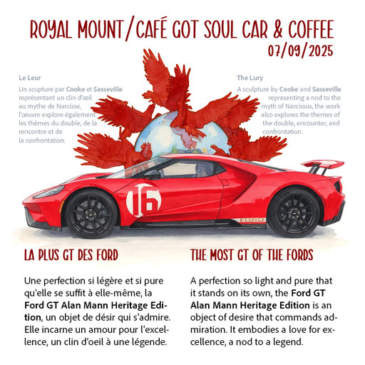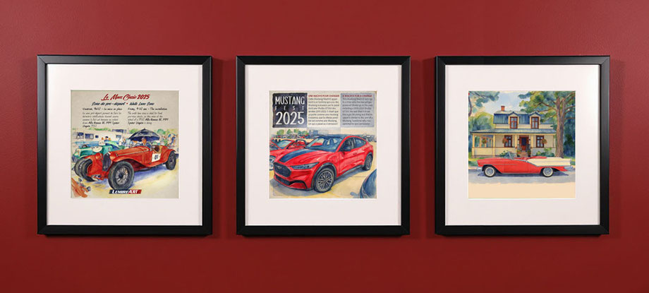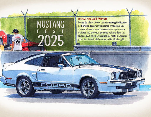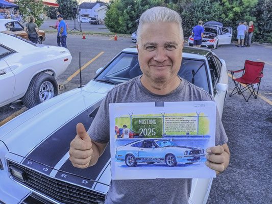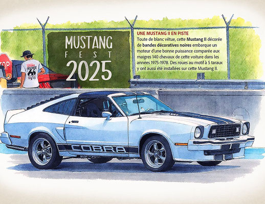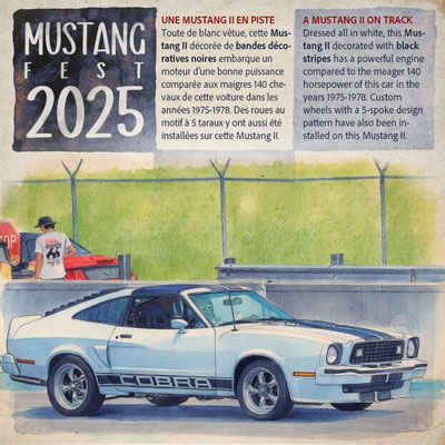C'est à partir de la page du carnet de visite du Mustang Fest 2025 que Sylvain Matte a opté pour une illustration narrative qui est passée du format carré au format rectangulaire 8,5X11 pouces, qui est plus facile à encadré.